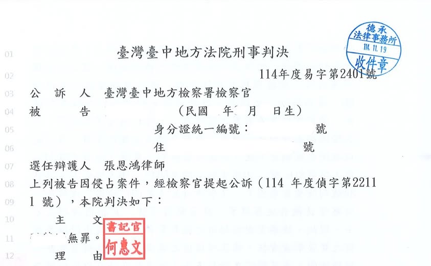 當事人因先前商業糾紛被提告侵占罪遭檢察官起訴,壓力十分沉重,委任本所張恩鴻律師後,本所律師替當事人整理並提出有利之證據,並指出起訴相關證據無法證明犯罪之處,感謝法官明察秋毫,認事用法正確,判決當事人無罪!